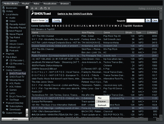 Station List: Mouse-over entries to view popup descriptions (for the longer entries). Use Shift + Click to select more than one station. Right-click selected items and choose Play, Enqueue or Bookmark. If required, you can change the default double-click and Enter actions via the Config (see below).